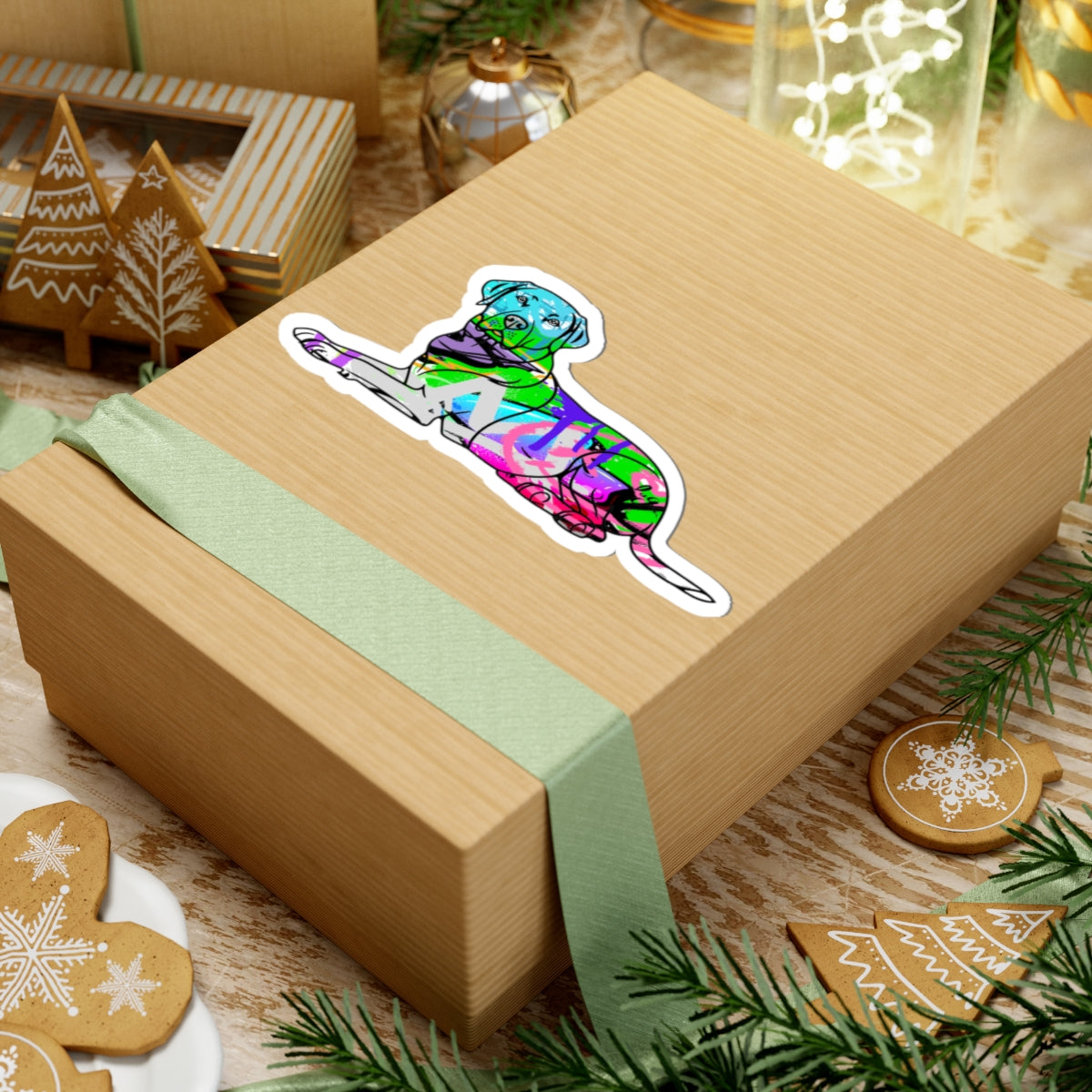A vibrant graffiti street art inspired digital illustration of a Pitbull, perfect for adding a pop of color and personality to laptops, journals, and windows. Ideal for adults who love street art and unique designs. Relevant for dog lovers, art enthusiasts, and those looking to personalize their belongings. Great for gifting on birthdays, holidays, and special occasions.