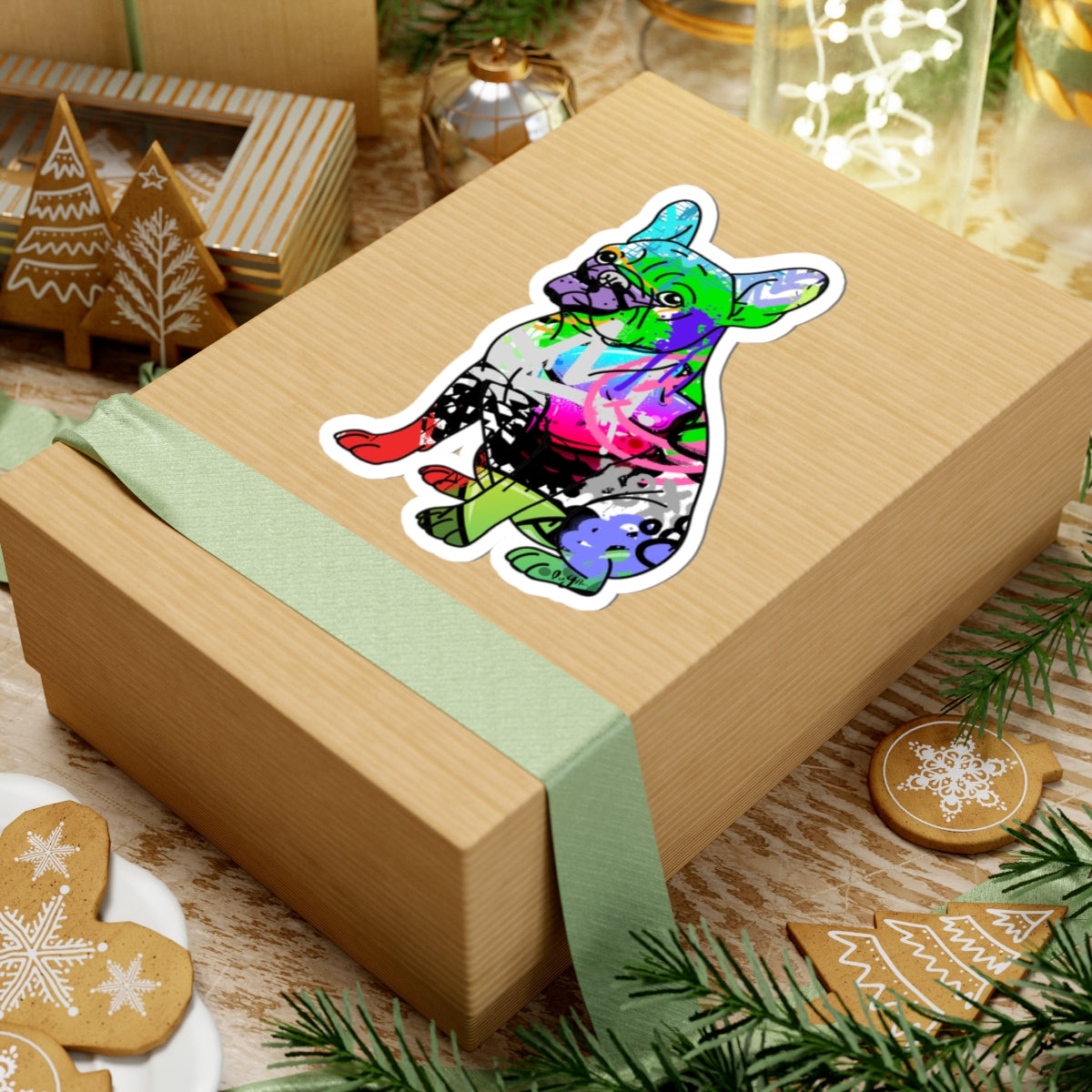 Vibrant graffiti street art inspired French Bulldog digital illustration sticker, perfect for laptops, journals, and windows. Gives a cool and edgy vibe, ideal for adults looking to add unique flair to their belongings. Relevant for gift-giving during birthdays, holidays, or as a fun treat for yourself.